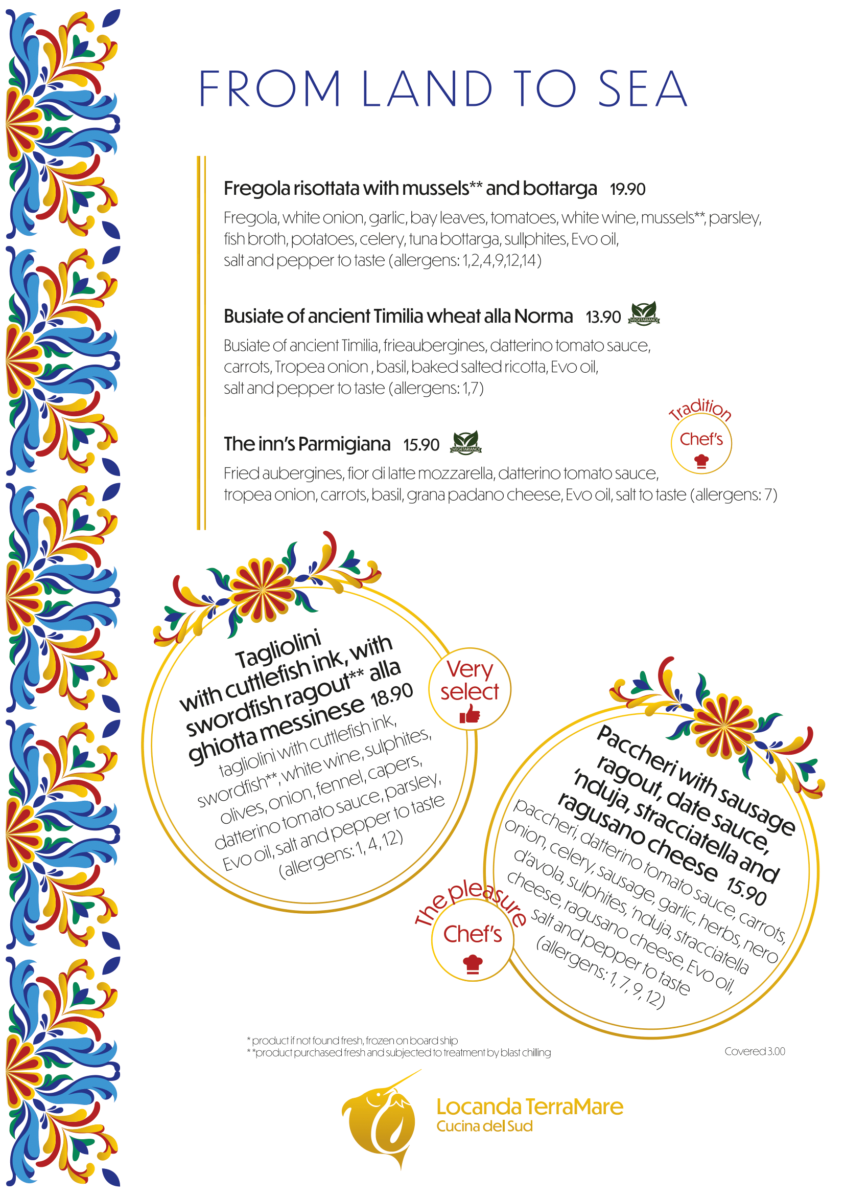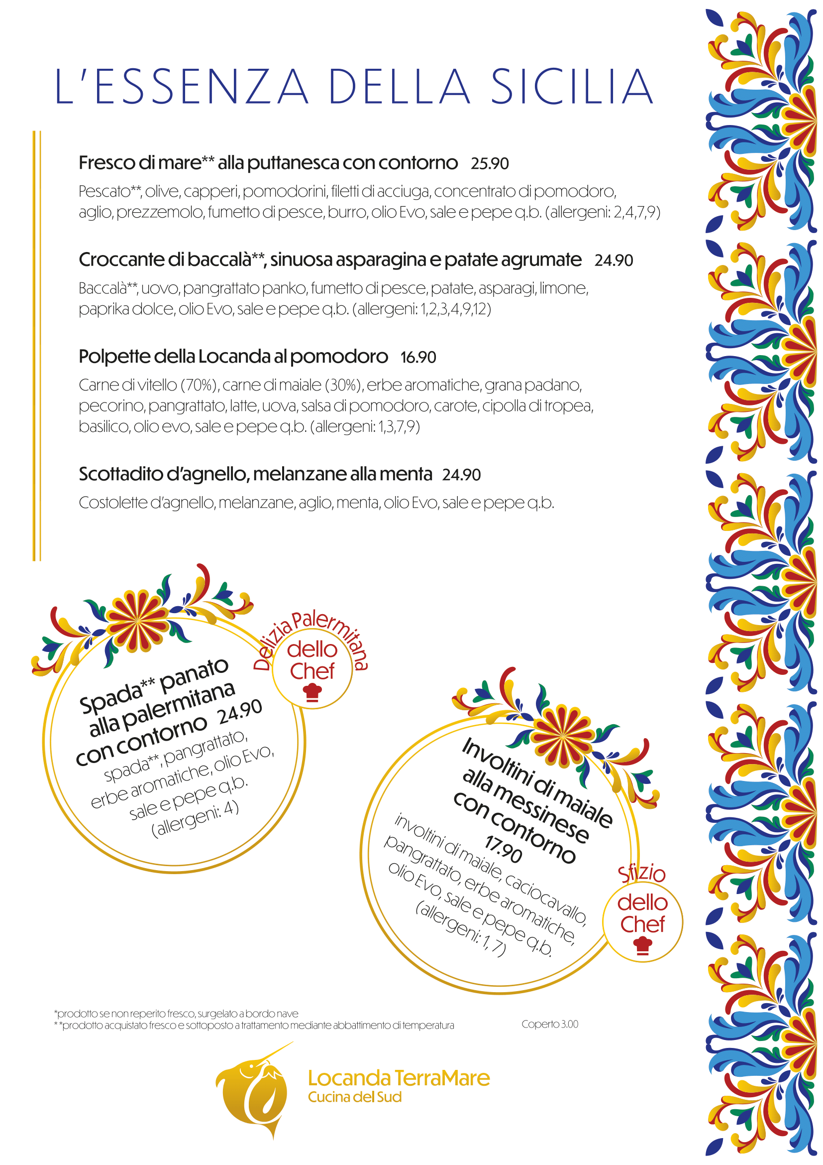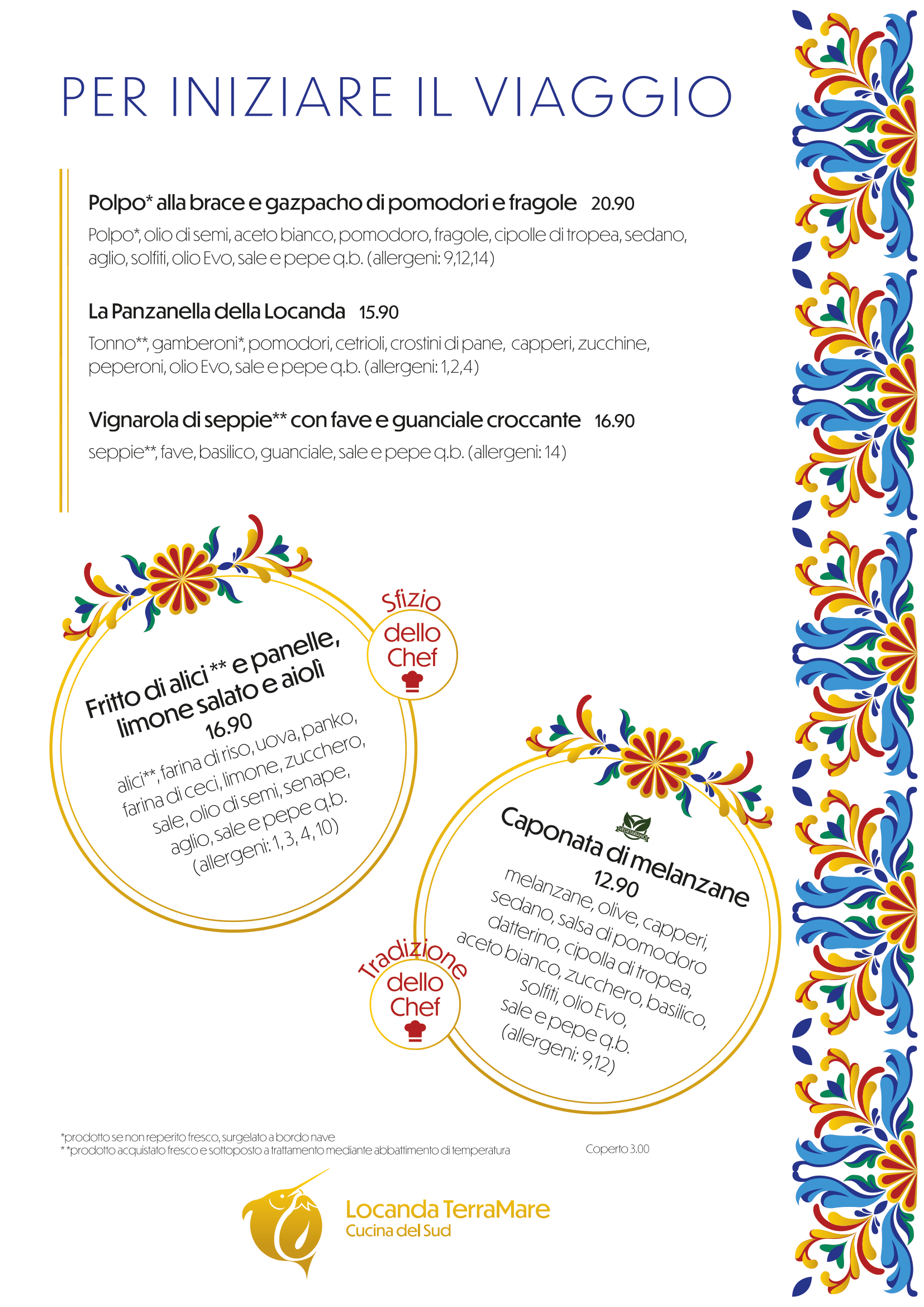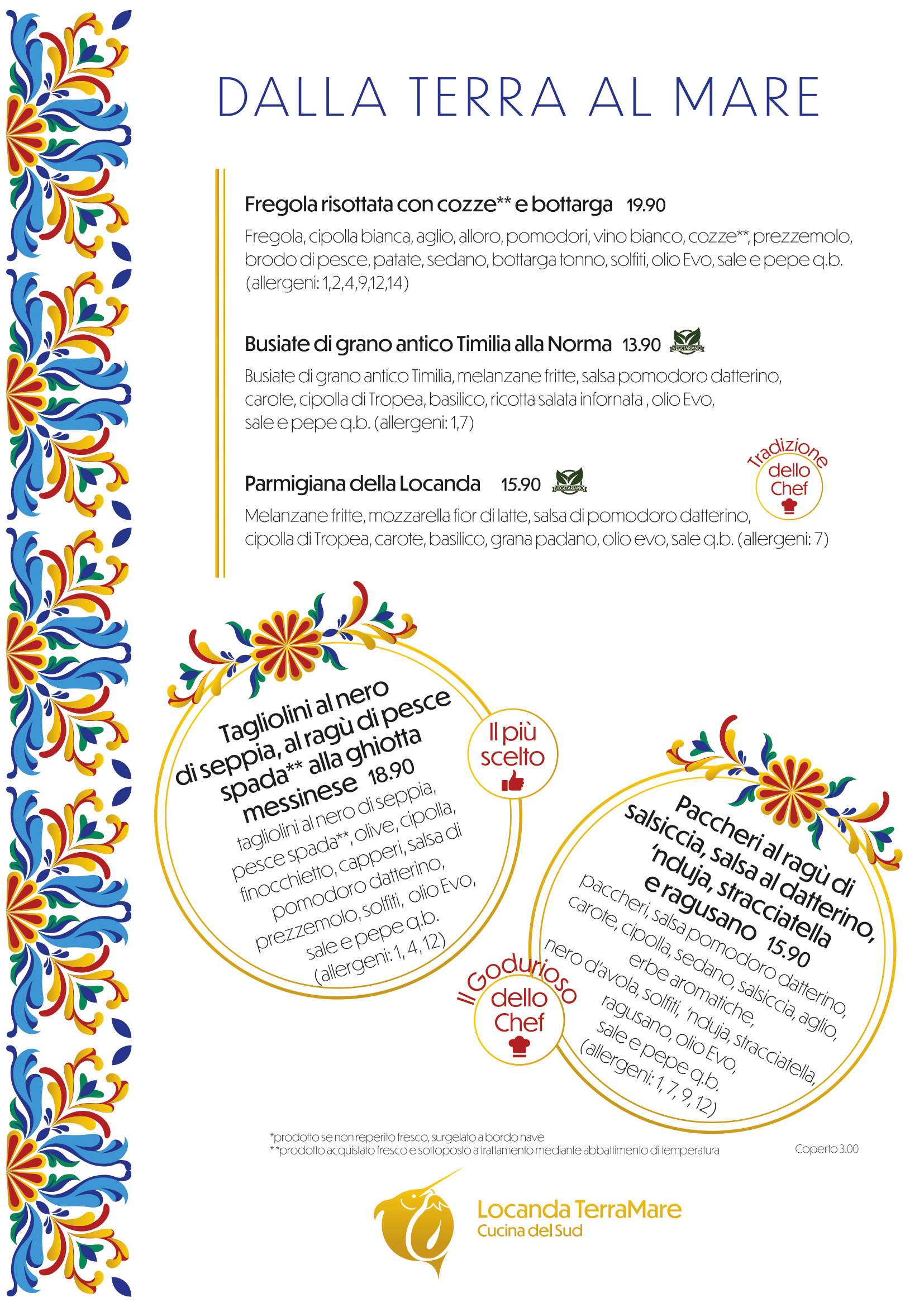 Il menù del ristorante TerraMare esprime il percorso professionale dello chef, con attenzione ai dettagli e l’uso di materie prime di alta qualità.